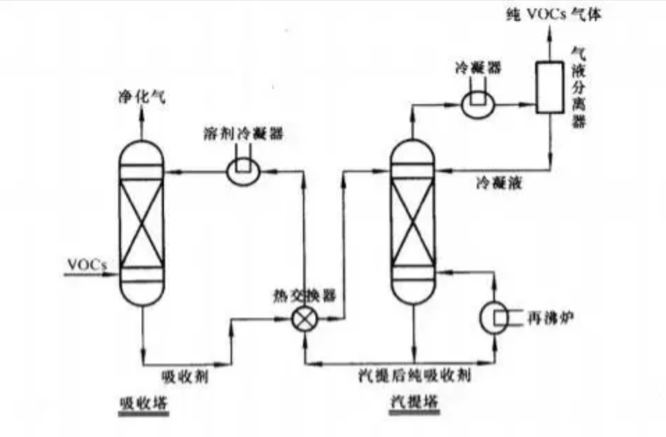 2、吸收法 吸收法可分為化學吸收及物理吸收,由于有機廢氣中含有大量的“三苯”氣體,化學活性低,一般不能采用化學吸收。 物理吸收是廢氣中一種或幾種組分溶解于選定的液體吸收劑中,這種吸收劑應具有與吸收組分有較高的親和力,低揮發性,同時還應具有較小的揮發性,吸收液飽和后經加熱解吸再冷卻重新使用。 常見工藝流程圖如下: