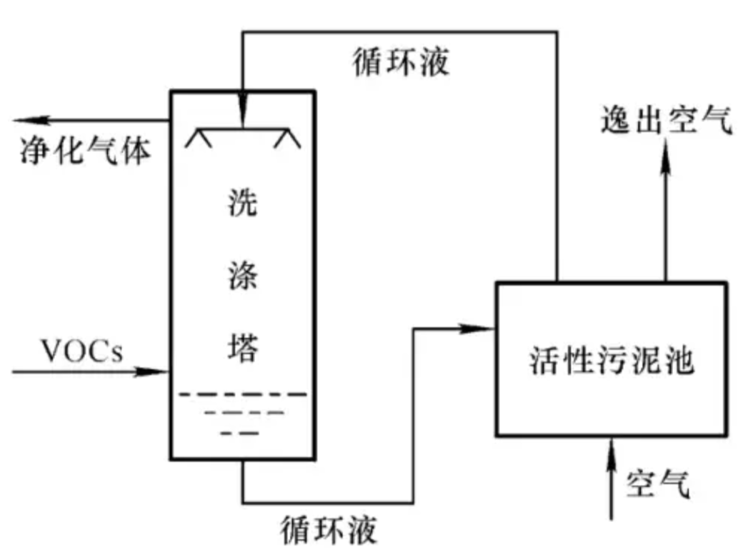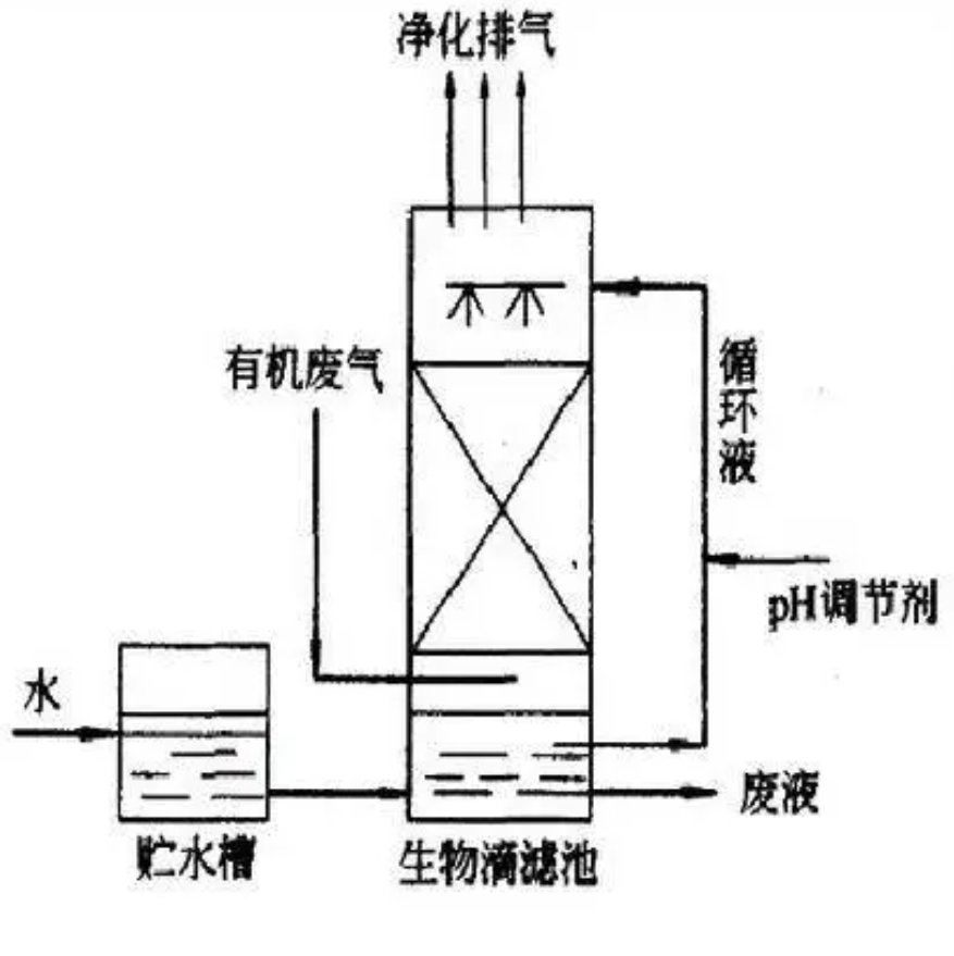 缺點:占地面積大,填料需定期更換,過程不易控制,運行一段時間后容易出現問題,對疏水性和難生物降解物質的處理還存在較大難度。工藝流程圖如下: