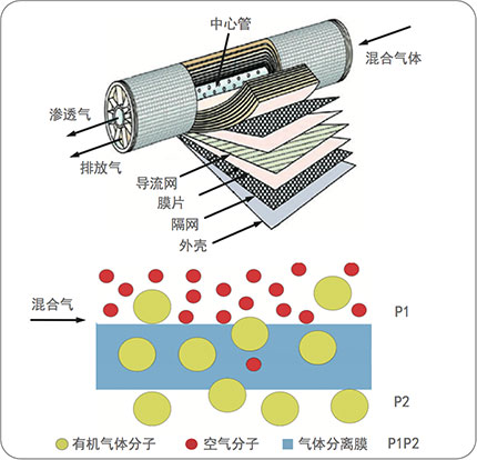 膜分離回收技術的原理是利用高分子膜材料對有機氣體和空氣的選擇透過性不同,實現兩者的物理分離,經過膜分離后,有機氣體濃縮富集回收。有機氣體與空氣混合物在膜兩側壓差推動下,遵循溶解擴散機理,使得混合氣體中的有機氣體優先透 過膜并得以富集回收,而空氣則被選擇性的截留,從而在膜的透過側得到富集的有機氣體,而在膜的截留側得到脫除有機氣體的潔凈空氣,達到有機氣體回收的目的。